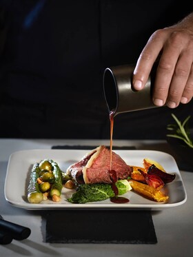 Lay out a leaf of the savoy cabbage with the seared side face down on a plate and spoon over butter and hazelnuts. Fold the leaf over on one side towards the middle. Place a cabbage leaf, burnt side up next to it. Place a trimmed and tranched piece of meat on top in the middle, and nappe with red wine sauce. Top with the Brussels sprout leaves and finish with some drops of the hazelnut butter.