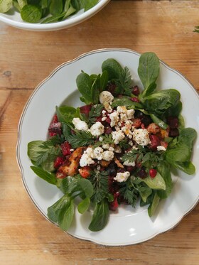 6. Arrange the greens on a serving plate, followed by the roasted vegetables and top with some crumbled feta.